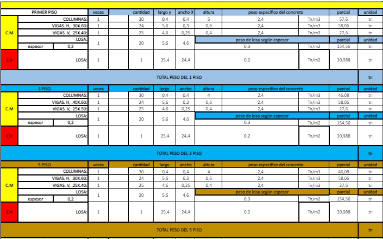En esta hoja de cálculo se realizan los cálculos correspondientes del peso total de los pisos, los periodos fundamentales de vibración, el análisis estático, el análisis dinámico y otros cálculos necesarios para la construcción.