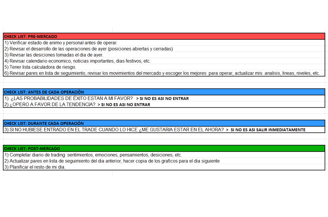 En la primera hoja de cálculo, tendrás un checklist de pasos verificables antes de entrar al mercado antes, durante y después de cada operación, para poder seguir un paso a paso de tu plan de trading.